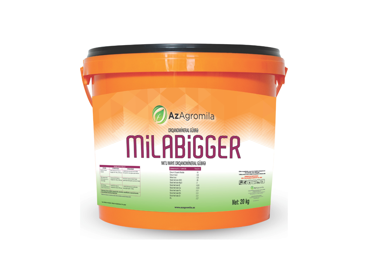 MİLABİGGER, tərkibi yüksək miqdarda Kalium (K), organik maddə və şelatlı mikroelementlərlə zənginləşdirilmiş organomineral gübrədir. Xüsusilə meyvə əmələgəlmə dövründə bitkinin ehtiyacı olan Kaliumun (K) maksimal səviyyədə mənimsənilməsini təmin edən yüksək organik maddə və meyvənin keyfiyyətinə təsir edən şelatlı mikroelementlər ehtiva edir.